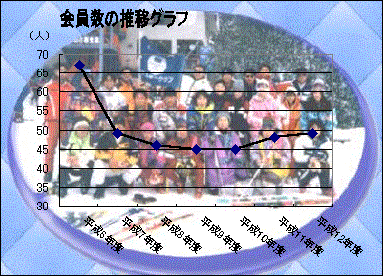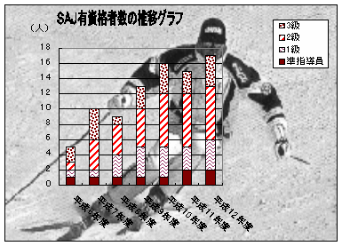 平成6年クラブ設立当時は、68名の方が会員として登録していただきました。全国的にスキー人口が減少の傾向にありますが、平成12年度現在までに会員数は毎年変動しつつ45名〜50名でほぼ一定しています。今後は、若者に人気のあるスノーボーダーの会員募集にも積極的に取り組んでいく予定です。 |